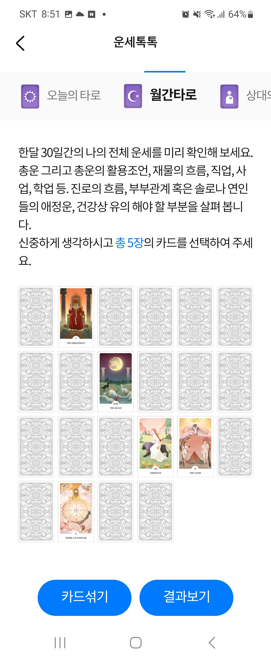 "나의 운명이 궁금하다면?" 이라는 문구가 있으며 그 아래에 오늘운세, 토정비결, 타로, 궁합까지 볼 수 있습니다.