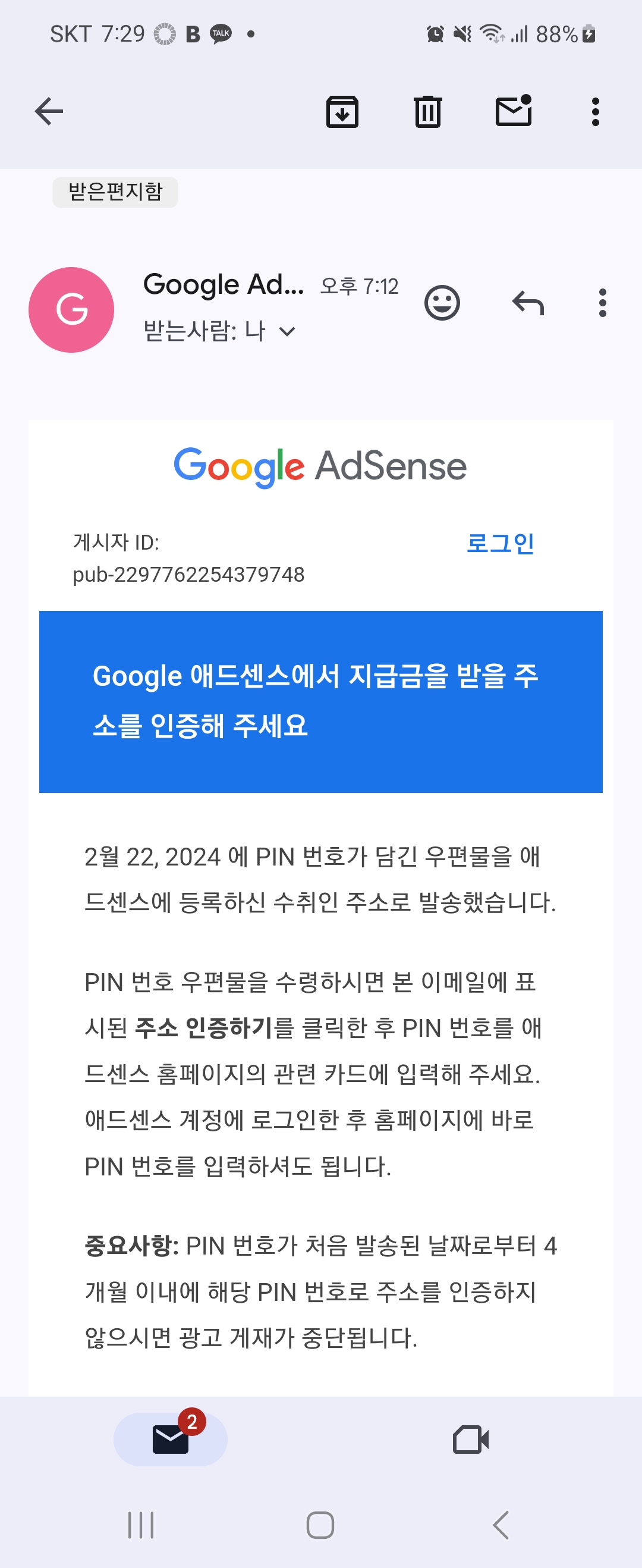 메일 내용을 보니 발송된 날짜로 부터 4개월 내에 PIN번호로 주소인증을 하지 않으면