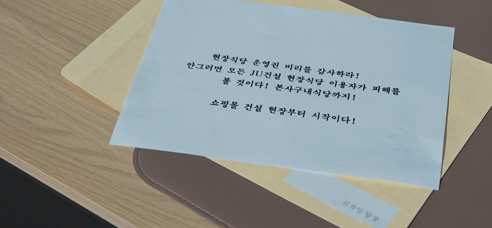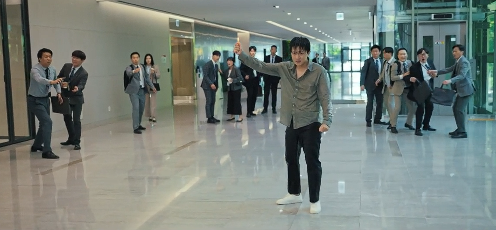 기술개발실 직원이자 구한수의 동기인 오윤우가 직장 내 괴롭힘을 신고한다고 회사 로비에서 분신을 시도했으나 황대웅 부사장의 저지로 실패했습니다.