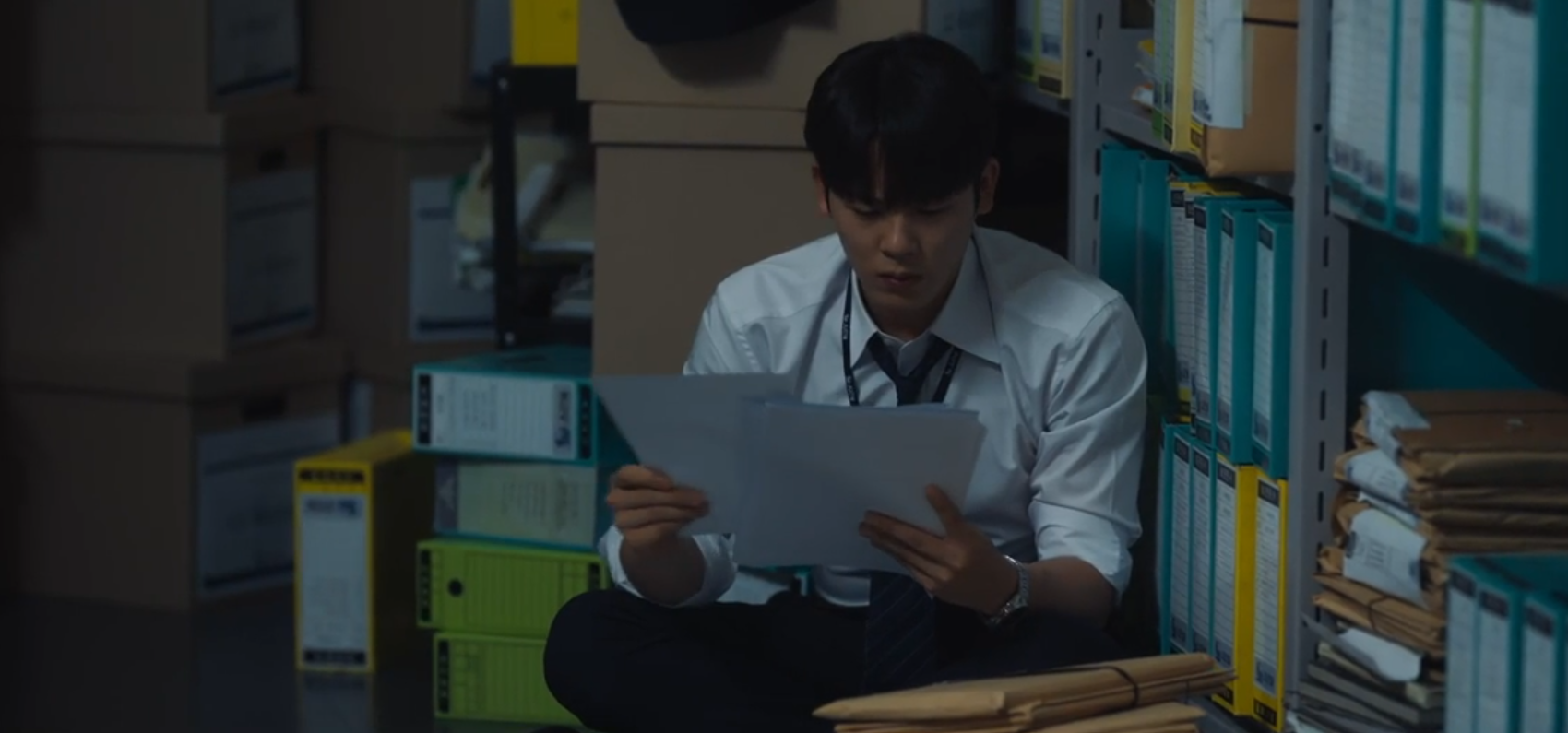 한수와 문대리가 문서고로 가서 2020년 입사 서류를 가지고 나옵니다.