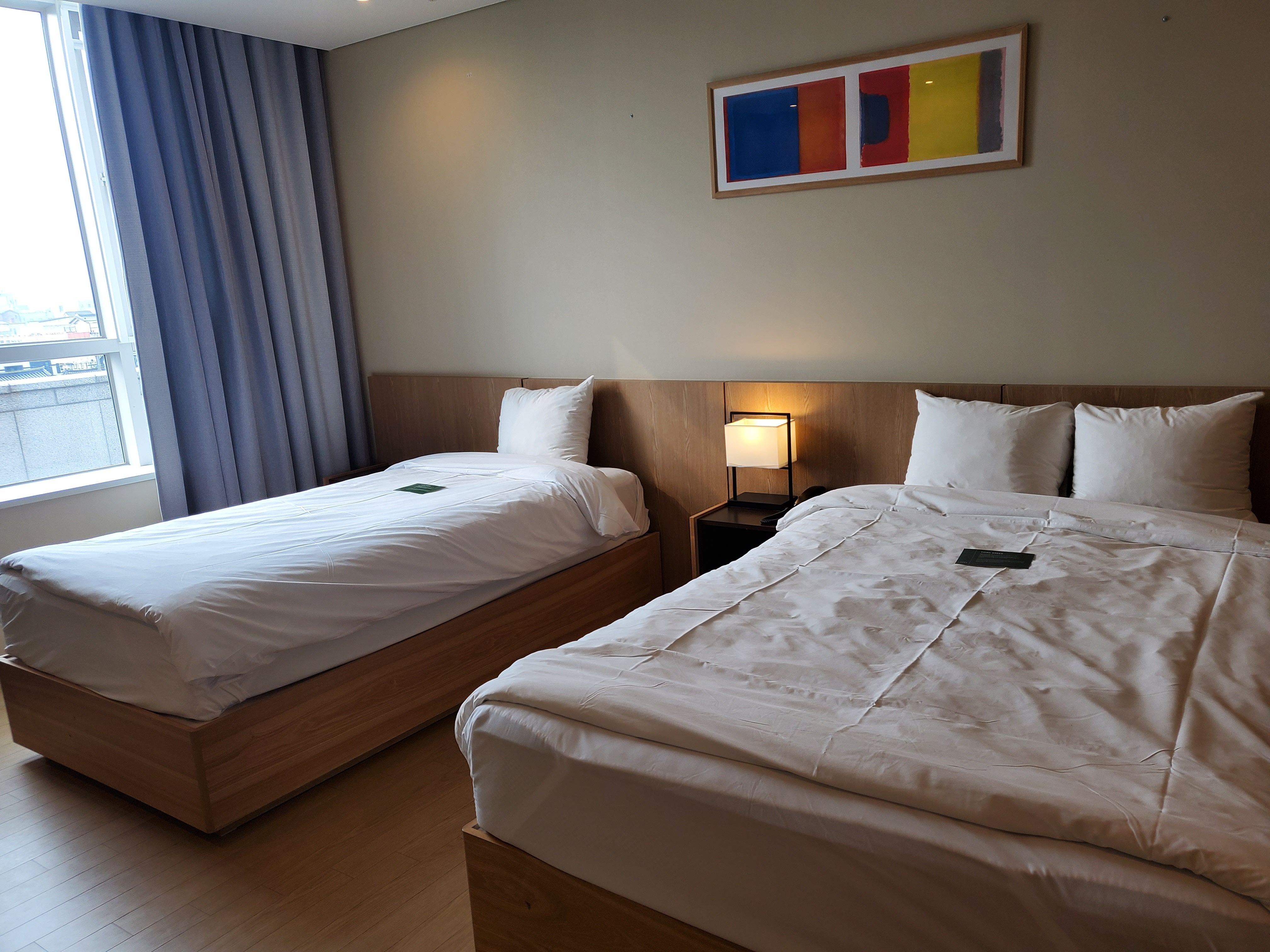 방이 2층이라 그런지 뷰가 그렇게 좋은 편은 아니지만 한옥마을이 잘 보이는 방입니다. 샴푸에서 칫솔까지 모두 마련되어 있었고 방도 나름 큰 편입니다. 1층에 서점, 식당도 있고 지하에는 사우나, 헬스장 등이 있습니다. 수영장도 있다고 하는데 저는 3월에 방문해서 그건 패스입니다.