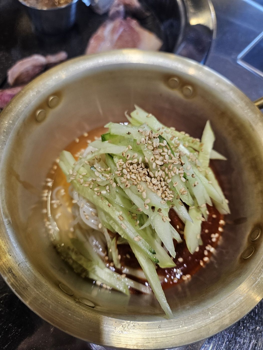 비빔국수는 세콤달콤 정말 맛있어서 돼지고기 한 점과 같이 먹었더니
