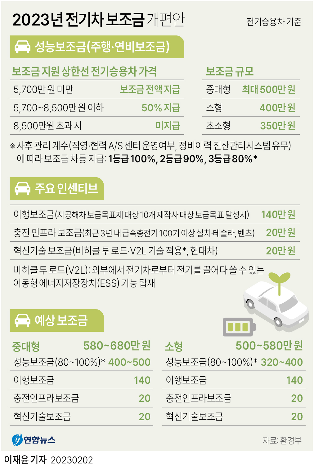 전기차보조금은 차량가격에 따라 차등 지급되며 2023년도에는 5,700만원까지는 100% 지원, 8500만 원 미만까지는 50% 지원되며, A/S운영센터, 지자체 추가 지원금에 따라 조금씩 다릅니다.